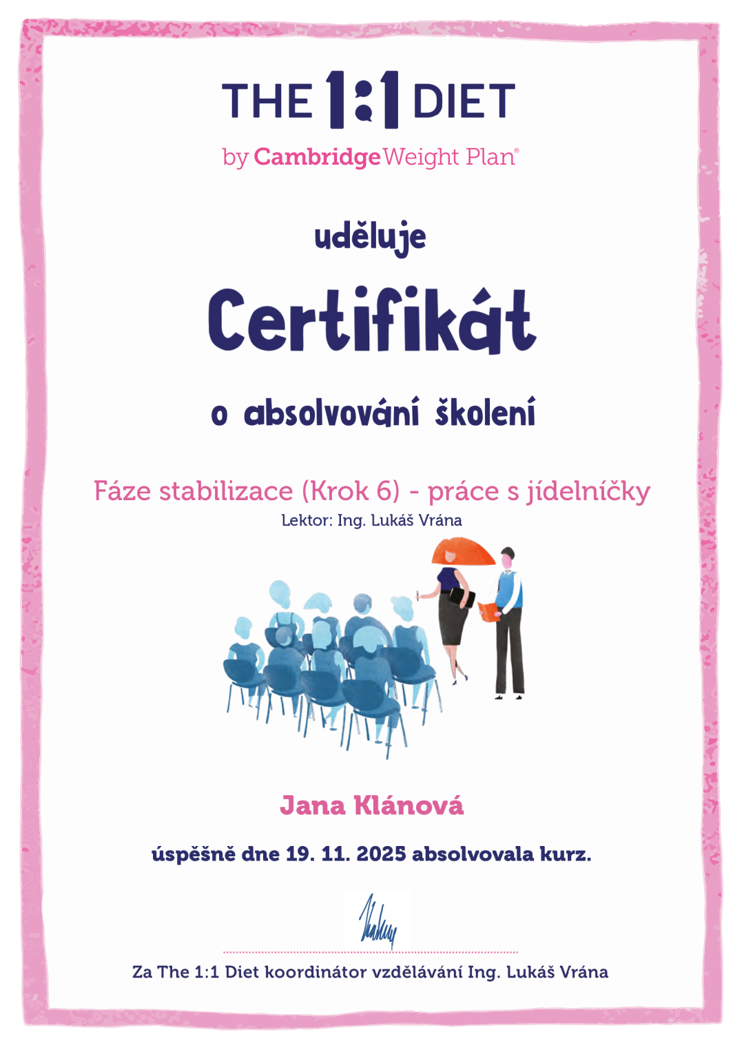 Program The 1:1 Diet by Cambridge Weight Plan staví na třech základních pilířích, z nichž jedním je podpora výživového poradce. Existuje několik studií, které prokazují, že jedním z faktorů ovlivňujících úspěšnost redukce je správné vedení. Jedině při pravidelných konzultacích, je možné klienta účinně motivovat a podporovat po celou dobu programu – díky zázemí a radám vyškoleného odborníka i pravidelnému měření složení těla na bioimpedančním přístroji.