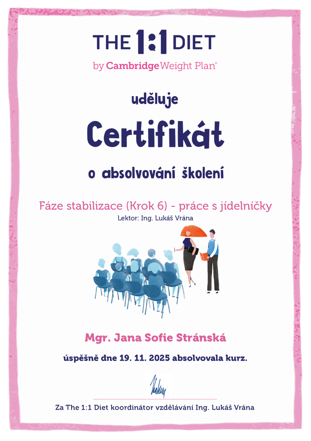 Jmenuji se Jana Sofie. Původní profesí jsem Baletka. Po absolvování Taneční konzervatoře hl. města Prahy, jsem tančila ve Státní opeře Praha. Následně jsem si doplnila vzdělání na VŠ v oboru Sociální a masová komunikace. Po ukončení kariéry v divadle se věnuji dětem i dospělým jako pedagog, trenér a choreograf. Program The 1:1 Diet by Cambridge Weight Plan se stal nedílnou součástí mého života hlavně v rámci mé trenérské praxe od roku 2009. S malou mateřskou přestávkou jsem věrnou a oddanou zastánkyní The 1:1 Diet s jeho úžasnou filozofií a přesahem za hranice pouhého výživového poradenství.