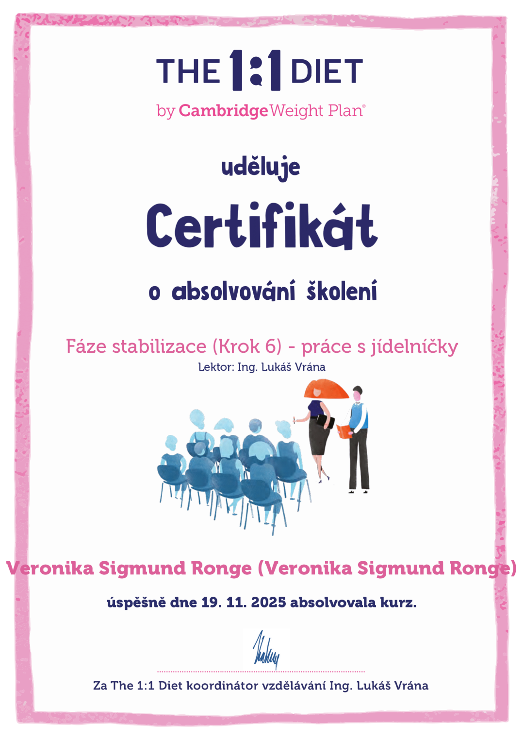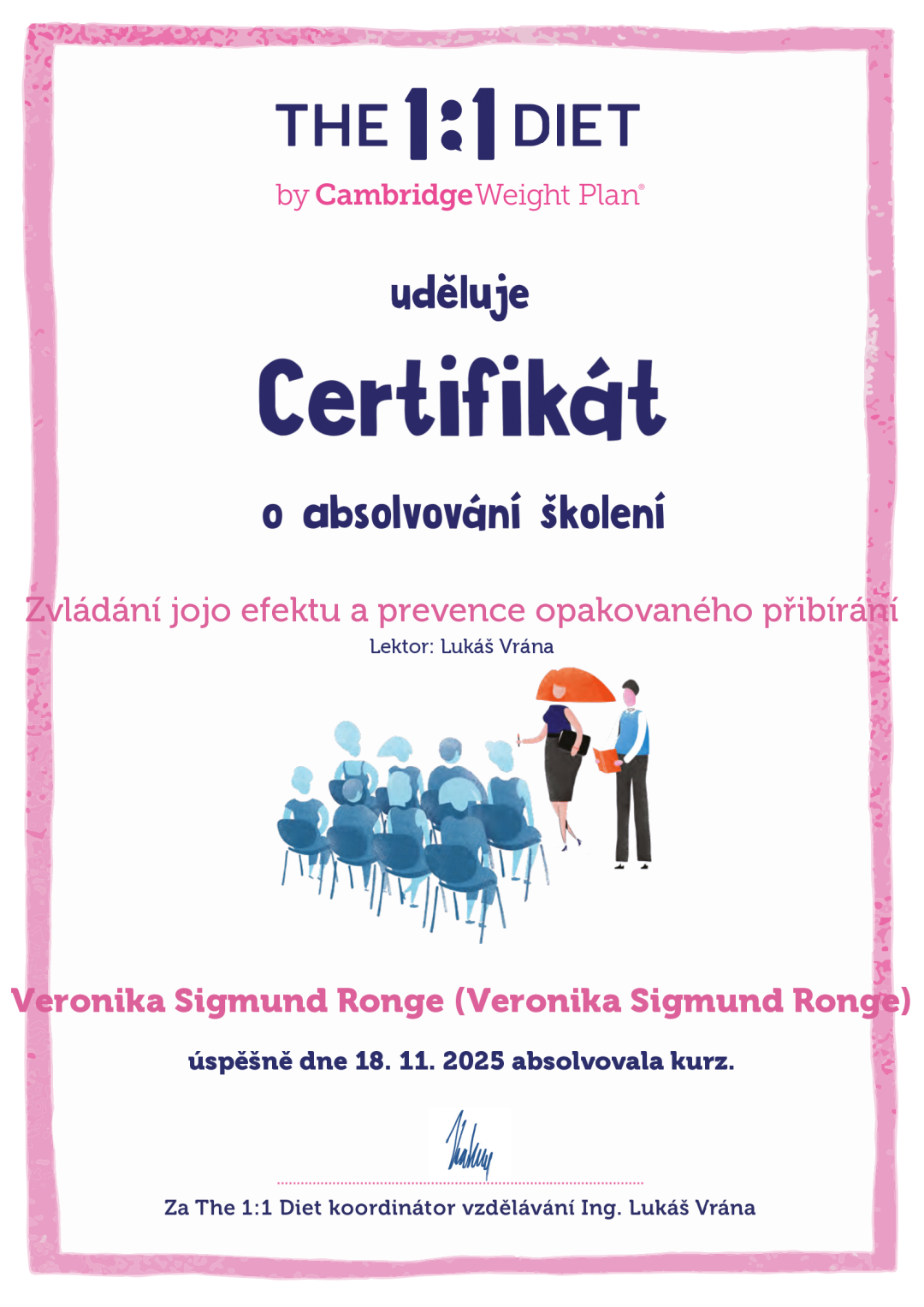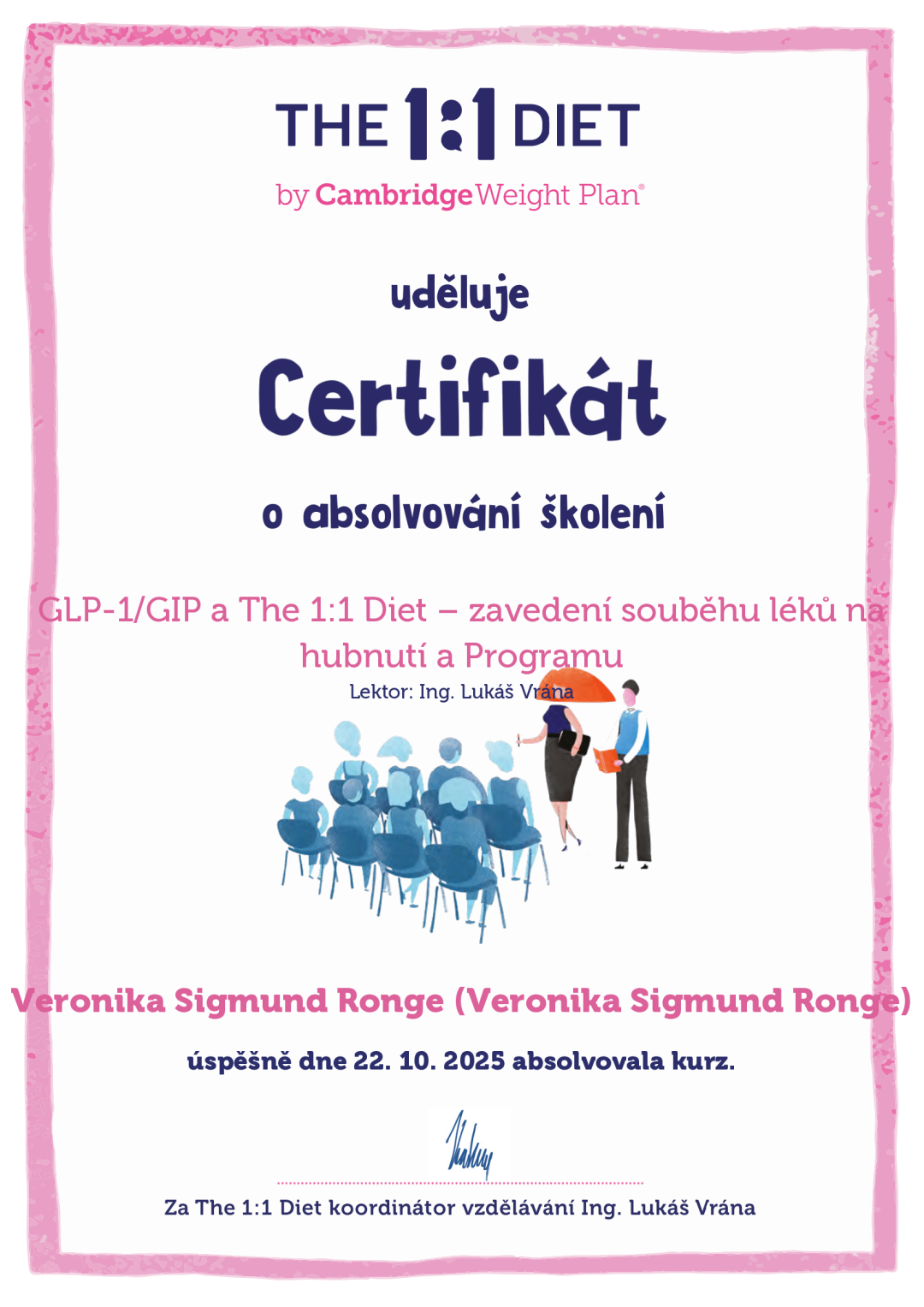 Program The 1:1 Diet by Cambridge Weight Plan staví na třech základních pilířích, z nichž jedním je podpora výživového poradce. Existuje několik studií, které prokazují, že jedním z faktorů ovlivňujících úspěšnost redukce je správné vedení. Jedině při pravidelných konzultacích, je možné klienta účinně motivovat a podporovat po celou dobu programu – díky zázemí a radám vyškoleného odborníka i pravidelnému měření složení těla na bioimpedančním přístroji.
